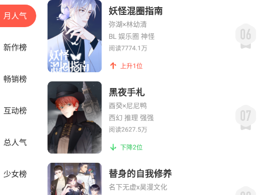 2.多种分类浏览方式,如按照题材、作者、更新时间等分类。