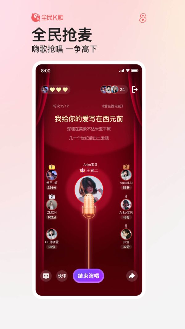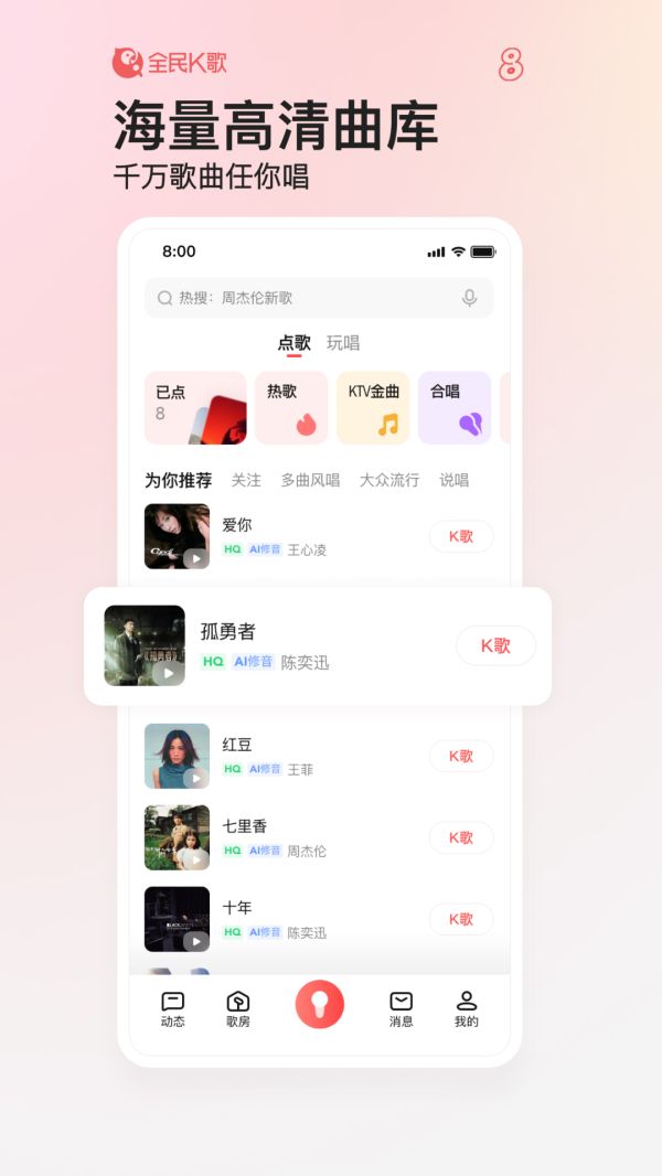 全民k歌正版是一款集K歌、偶像养成、音乐分享于一体的移动软件。免费下载后,用户可以通过软件选择自己喜欢的歌曲进行录制,并可以选择自己的歌曲配乐、调整音效等。全民k歌正版app还提供了众多流行歌曲的原版伴奏,以及各种配乐和特效供用户使用,使用户在录制自己的歌曲时能够更加有创意和个性。感兴趣的话,就来免费下载吧!