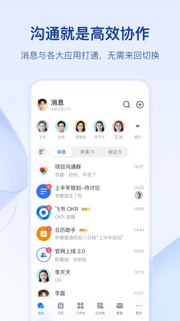 飞书app最新版本是一款办公场景沟通协作软件,旨在提供高效的团队协作工具,帮助企业提升工作效率和沟通效果。软件下载后,兼具即时通讯、文件共享、语音转文字、在线会议等功能,能够满足企业内部员工的办公需求。飞书最新版本app能够帮助企业团队实现高效的沟通和协作,提升工作效率和团队合作力。有需要就来下载吧!
