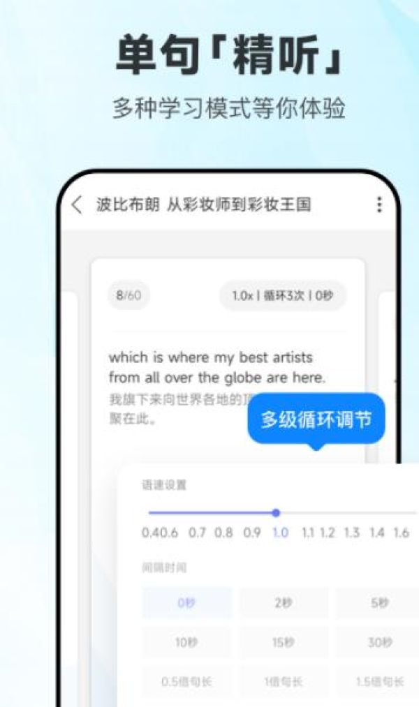 1.有语速调节,实现智能高亮播放,让你可以随时随地都能练习英语听力。