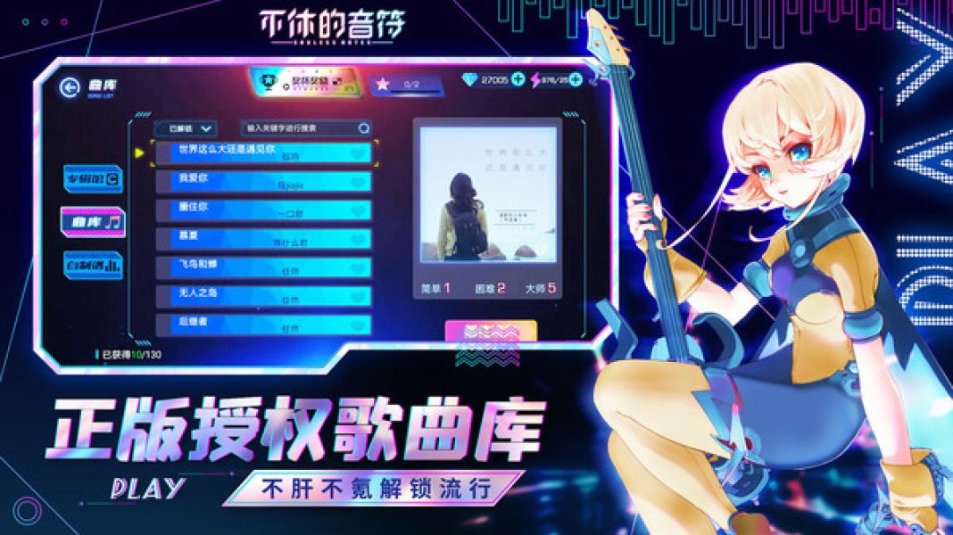 不休的音符官方正版是一款音乐节奏类手游,玩家需要根据音乐的节奏点击屏幕上出现的音符,以完成关卡。在游戏中,玩家可以选择不同的音乐曲目进行游玩,每个曲目都有不同的难度等级和节奏风格。玩家需要通过默契的手指操作,准确地点击屏幕上出现的音符,以获得最高的分数。游戏中的音乐曲目多样且丰富,从流行歌曲到古典音乐都有涵盖,玩家可以根据自己的喜好选择不同的曲目进行游戏。