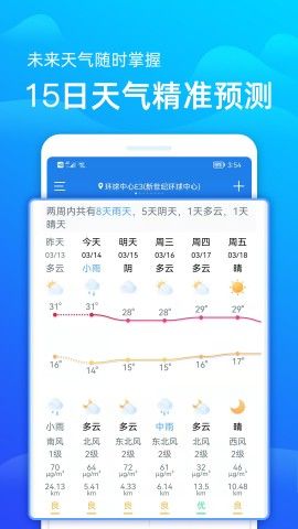 3、未来几天预报:提供未来几天的天气预报,包括温度变化、降水情况等,帮助用户合理规划行程。