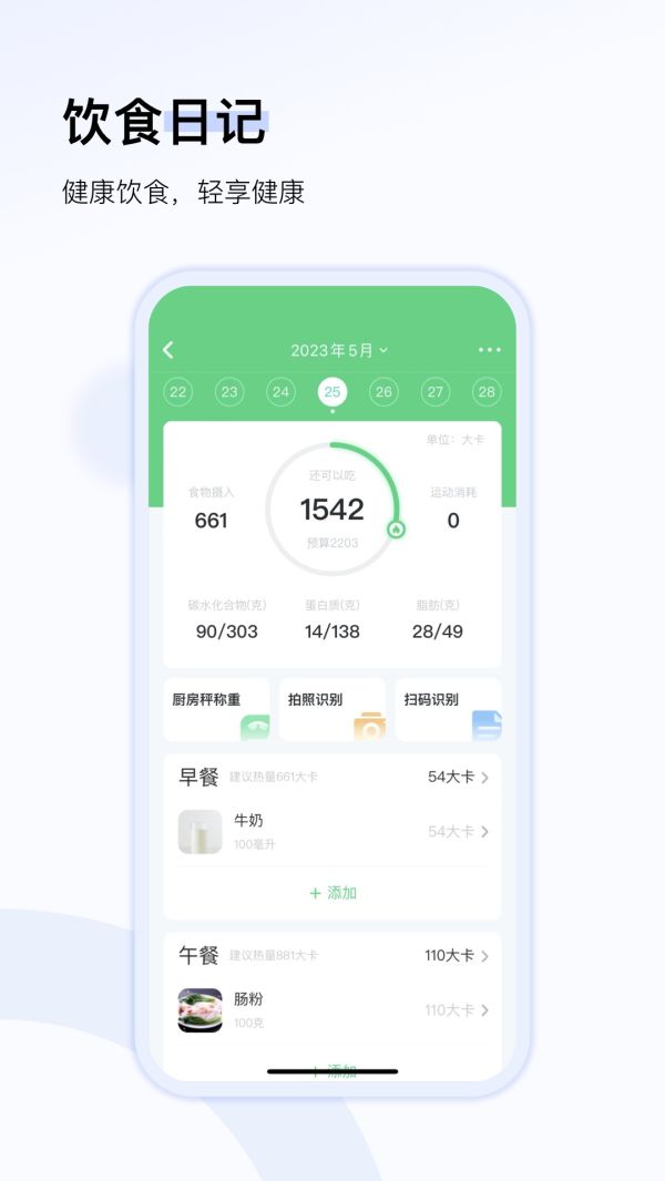 2、三餐热量随手记录,HealthKit记录即时同步,改善习惯更加方便。