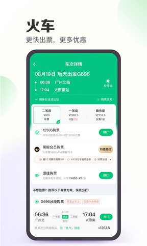 1、火车票:支持网上抢票,网上选座;快速出票,支持邮寄;更多服务,红包优惠!