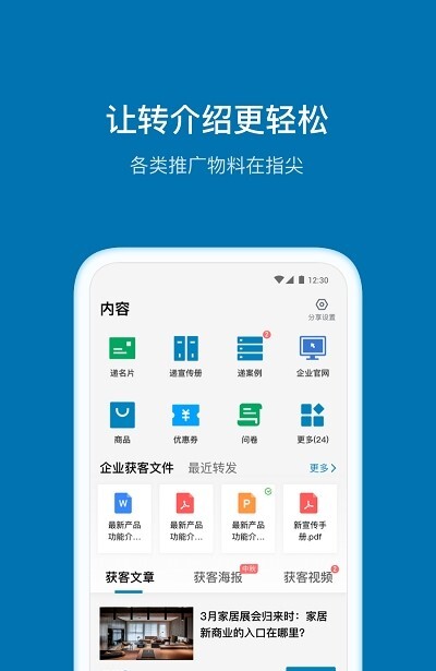 1.文章获取客户的新方式,智能名片获取客户文章,者通过分享,实现个人品牌持续裂变展示,丰富的我们媒体文章资源可供选择,支持上传文章,形成企业图书馆,潜在客户点击客户文章、个人信息和查看情况,实时反馈。