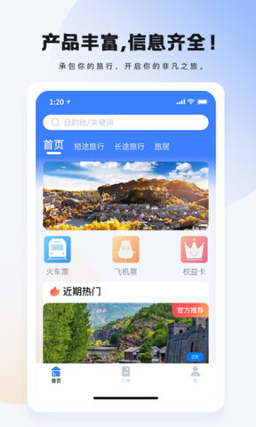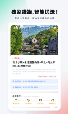 爱玩旅行网APP以提供高品质旅游产品为核心,以康养、文化旅游为理念,以贴心、一站式服务为宗旨。凭借对顾客需求的准确把握以及完善的服务体系,为客户提供高端、便捷、优质的旅游服务。爱玩旅行网APP拥有超多丰富的资源内容,帮助用户出现旅行的最主要的资源,更加方便实用,大家在这里面可以更好的查询自己去到的目的地里面的一些优质的资源。凭借着用户的需求,给客户提供高端,便捷的优质的旅行服务,拥有自己的大巴车队。
