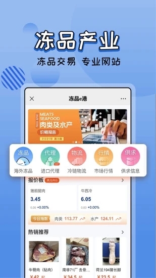 1.【买家功能】软件为冷冻产品批发买家提供猪、牛、羊、水产、网上购买预制菜等,具有询价、下单功能,推出热销推荐、餐饮采购、冻品头条、行情报告等专区,更贴合冻品批发使用场景。