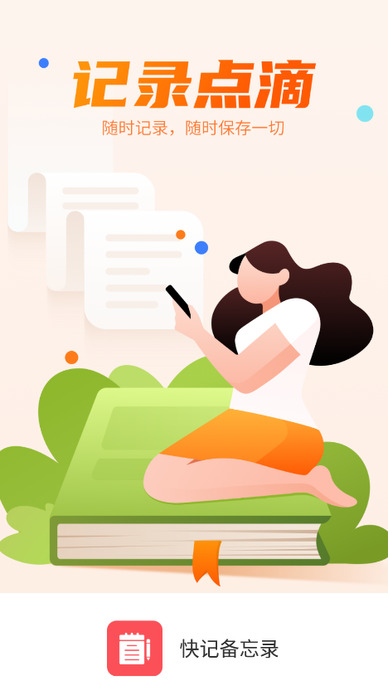 4.清爽简单的界面,简单的操作流程,一键新建备忘录,随时随地记录灵感,立即使用快记备忘录,打造自己的专属记事本、笔记、日记、账本、便签备忘录!