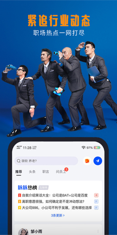 3.超过2500万职场精英正在打造职场知名度。关注同行动态.扩大工作场所的人脉.看大佬职播.观点实时互动,打造职场知名度。