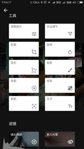 3.这儿有很多滤镜效果,还有各种实用的工具,可以调整图片,突出细节。