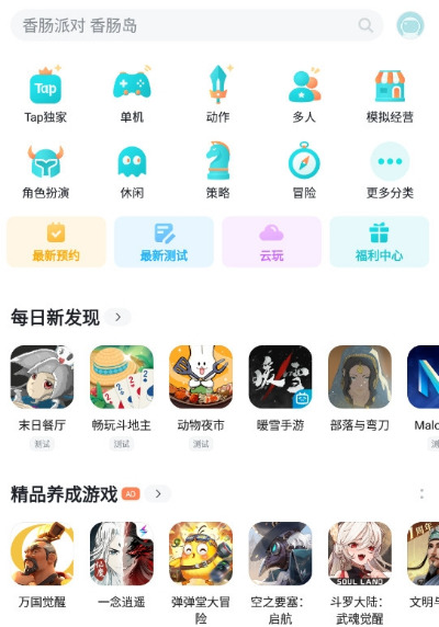 发现板块相当于游戏库,主要分为类型和新游,测试区域。