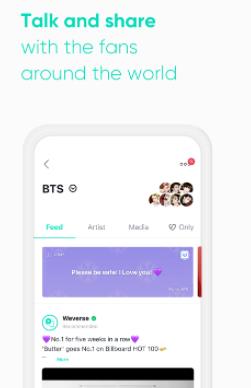 weverse安卓下载的这款软件是一款明星社区软件,专为广大粉丝团准备的。weverse安卓下载的这款软件中可以了解最新的韩国明星情况,更有着韩流社交的区域,大家可以在这里认识更多有着相同idol的朋友,有着相同的追星话题等,分享自己喜欢的追星情况,而且weverse平台入驻中的明星会在线和粉丝交流,实时更新最新的生活动态等。分享明星的美好时刻,表达对他们的喜爱,和全世界的粉丝一起交流。喜欢就快来下载体验吧!
