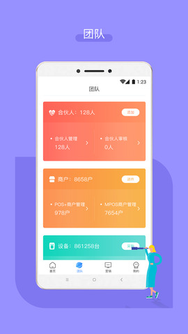 4.掌握团队业绩,合作办公时可查看合作伙伴数量、商户数量。