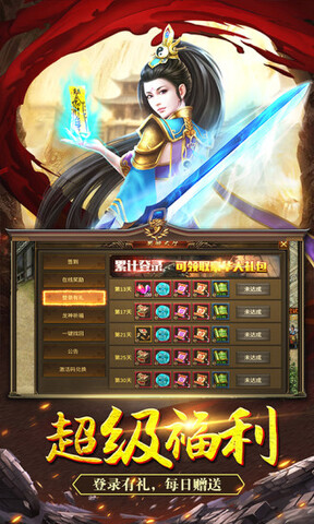 6、玩家登录游戏时送屠龙宝刀,签到和礼包获取。