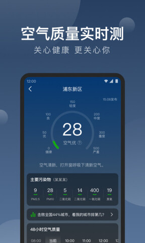 1.空气质量,PM2.5等6项空气质量指数实时看,24小时天气情况逐时看。