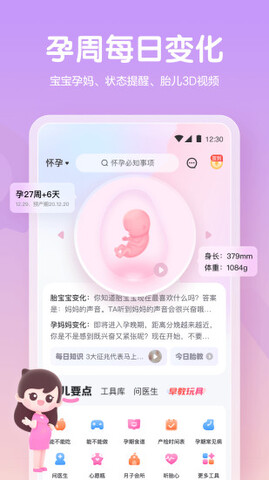 2.孕期育儿工具:能吃能做、胎动、宫缩、产前检查解读、孕期食谱、分娩食谱、婴儿名称、婴儿身高体重记录、婴儿辅食、儿歌故事等。
