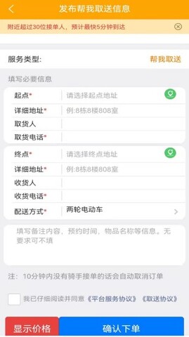 3.可以随时进行下单,将具体的跑腿需要运送的详情填写,就会有专业跑腿为大家来服务。