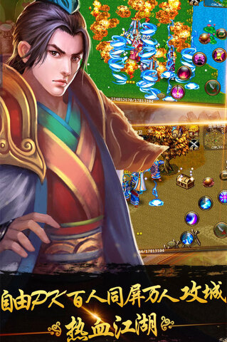 3.大型战场阵营对抗、万人同图、沙场争锋激情碰撞,野外即时遭遇,自由PK,尽享江湖热血。