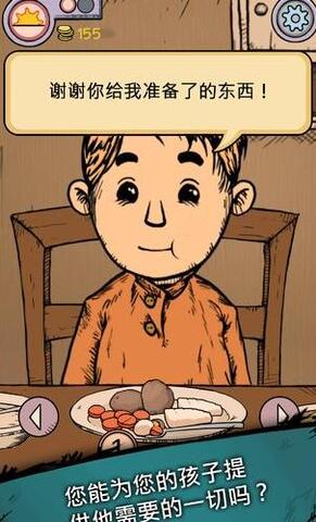 3.在游戏中搜集食物,工作赚钱,同时帮孩子做饭、缝补衣物,陪孩子一起玩。