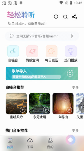 聆听音乐官方版是一款体积小巧、功能强大的免费听歌软件。下载后,软件除了普通歌曲播放外,还为用户推荐白噪声资源,帮助放松心情,更有当天的热门歌曲播放。用户可以通过聆听音乐官方版软件的搜索功能,轻松找到自己喜欢的音乐并进行下载,所有音乐免费听,还有超多好听的音乐等你来发现和体验。喜欢听音乐的软件,就来下载吧!