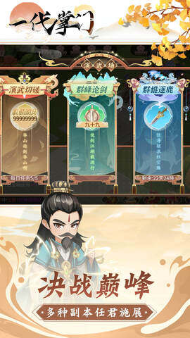 一代掌门是一款好玩的古风江湖经营类手游,玩家需要管理自己的门派,包括修建建筑、培养武艺、开展任务等,以提升门派的实力和声望。一代掌门手游中还可以招募培养各种类型的弟子,每个弟子都有自己的独特技能和特点,玩家需要合理分配弟子的修炼任务和搭配最强的阵容来进行挑战,获得四象之石等奖励来发展门派。