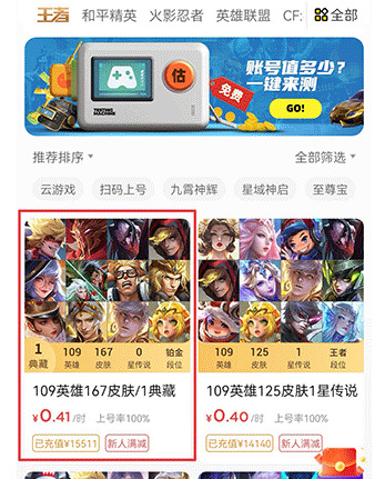 1、下载并打开租号王app,在租号界面选择你要租赁游戏的选项。