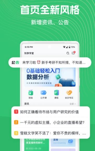 知享学堂app是一款好用安全的在线网课学习软件,汇聚了海量优质课程,其中包括职业技能课程、兴趣爱好课程、考研课程等多类别课程,让用户尽享丰富多彩的学习内容。知享学堂app还可以随时随地通过手机或平板电脑观看教学视频,并根据自己的进度进行学习。有需要就快来下载使用吧!