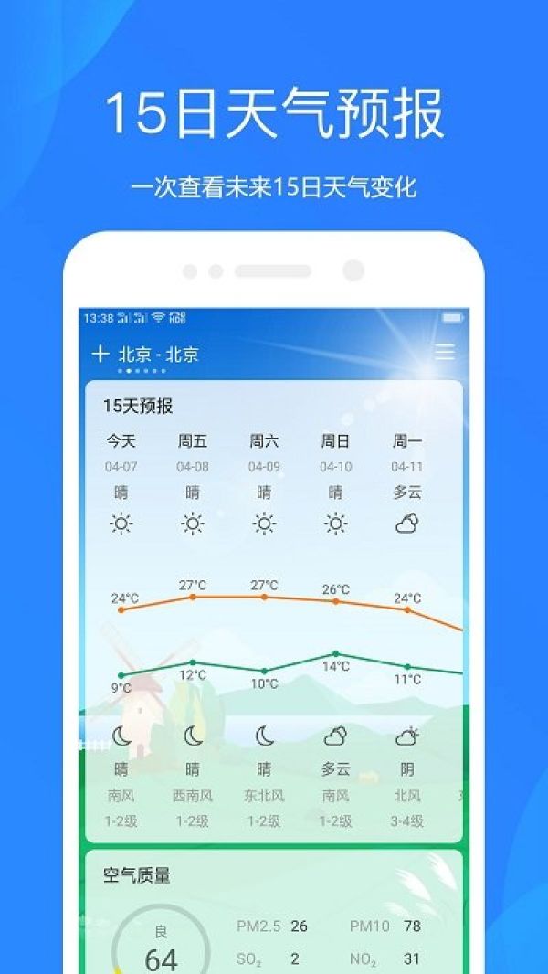 2.天气预报:提供未来几天的天气预报,包括温度变化、风力风向、天气状况等信息,让用户可以提前做好天气的准备。