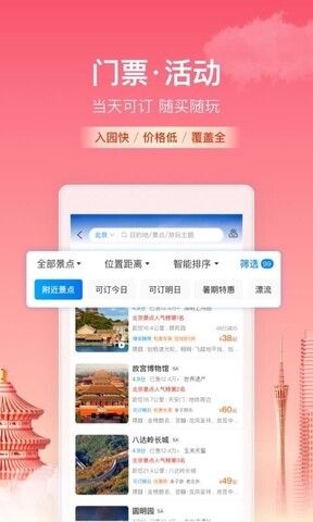 3、景点门票预订:可以搜索并预订各地的景点门票,支持在线支付和预订修改,可以查看门票价格、优惠活动、评价等信息。