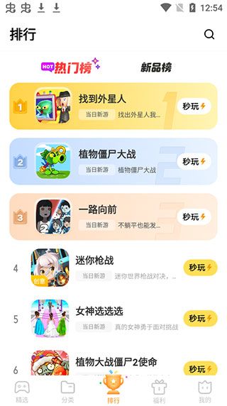1、通过本站下载并安装秒玩小游戏免费版游戏,运行软件,可以看到有五个板块可供选择,分类,排名,福利,我;