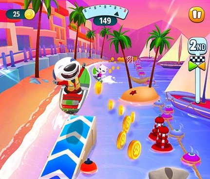 此游戏为九游版本哦!玩家将跳上摩托艇,会说话的汤姆或会说话的安吉拉与你相伴,体验最令人心潮澎湃的水上运动!
