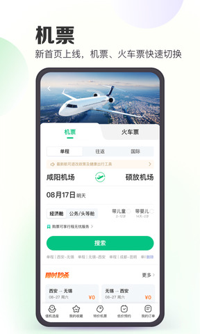 3、机票:全球机票便宜飞,放心飞!每天都有特价机票,1折;快速预订往返机票,在线值机,手机专属折扣,支持在线退款申请;