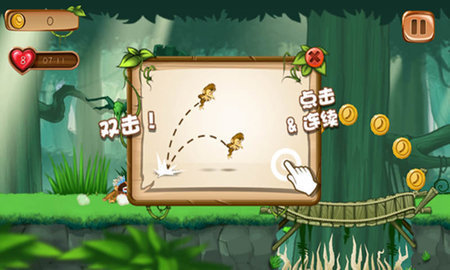2.操作也相对简单,玩家可以通过用手指轻松点击触摸屏来控制物体的移动。玩家可以控制小猴子以避免学习的机械陷阱和老猴子的攻击,并将所有金币放入口袋。