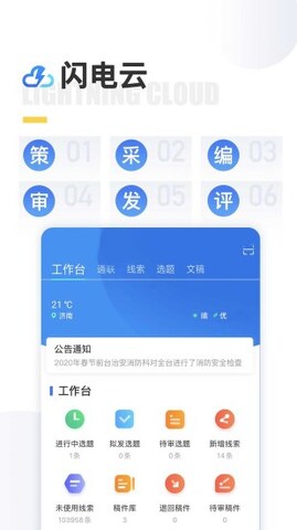 闪电云平台是山一款专门打造的办公管理软件,用户可以在这里找到最新的信息热点,进行分析,快速整合发布。闪电云平台通过灵活高效的业务流程,将收集到的新闻分成电视栏目、广播新闻、新媒体、报纸等业务系统提供优质的新闻节目,统一管理新闻资源、统一使用,一站式制作,实现全程跨媒体节目、跨终端分发和传输,改变单向通信、被动接受观众的方式,加快立体新闻制作,重构媒体采编流程,构建广播电视媒体传播体系融合发展。感兴趣的用户,就来下载闪电云平台体验吧!