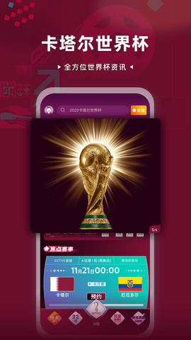 央视体育5直播下载后,用户能得到一款中央广播电视总台官方软件,软件致力于为用户提供精彩的活动直播、综合视频点播、有深入的体育赛事报道,还有主持人、评论员专业点评等内容。央视体育5直播下载后,用户很快就能感受到,这里汇集了世界上最受欢迎的体育联赛直播和比分数据,你可以在这里知道各种你想知道的信息。软件界面清新,直播内容高清,无广告干扰,在线观看不卡住,随时随地观看。想要看各种体育赛事的各位一定不要错过,赶快来下载体验吧!