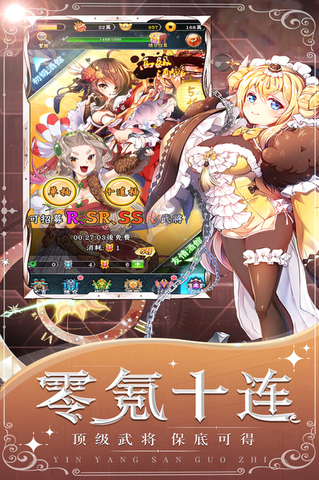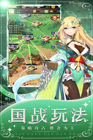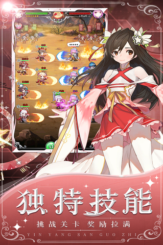 阴阳三国志是一款超人气二次元放置策略培养手游。这里有数百名高精度、纯净、美丽的知名武将与你一起战斗!玩家登陆就领十连,SSR红将保证,百抽福利嘉年华,稀缺金卡武将都在等你!阴阳三国志全员无废卡, 不肝不氪,多倍挂机收益,一键扫荡,资源无损转换助武将平步青云!玩家能够探索各种创新玩法,如:机关神兽培养,轻度的SLG国战,无限爬塔跨服远征。四大阵营武将克制羁绊,搭配烧脑策略,打造你的专属军团阵容。感兴趣的话,就来下载阴阳三国志体验吧!