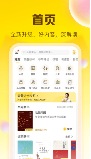 2.非凡精读,(非电子书)全品类、多元化、全新的分级阅读阅读模式,馆内云集余秋雨、徐英瑾、刘蔚涛、康妮、崔玉涛等一线名师专家。书籍解读类别涵盖40个+知识领域,从入门、高级到精通,打造系统的分级学习方案,为终身成长者提供理想的听书馆。