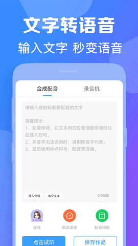 培音app是一款专业的语音助手配音软件,适用于广告配音、专题片配音、商场商店、广告促销配音、摊位叫卖录音、英语听力音频、有声朗读、超市促销等各种场景配音,还有清仓大处理。培音app无限时间、无限地点,可适用于各种场合,操作简单方便。还有各种配音内容,你可以选择各种不同的声音,功能非常丰富,让用户无忧无虑使用,超多版本可以使用,随时随地都可以轻松体验,还能够轻松做出超高质量的好声音供你选择。