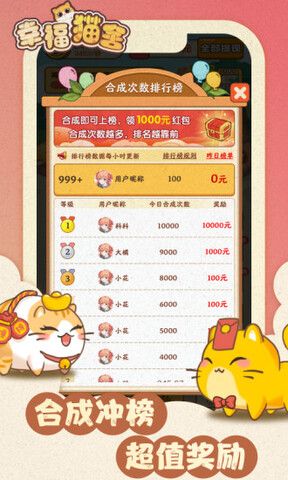 幸福猫舍是一款轻松随意、可玩性十足的合成小猫赚钱游戏。玩家可以在这里体验升级可爱小猫的快乐,不同的颜色,不同的体型,各种小猫等着你,在享受被小猫包围的乐趣的同时,还可以获得小猫掉下来的红包奖励!在幸福猫舍游戏中,玩家真的可以培养猫。各种各样的猫以最可爱的形式展示在玩家面前,等待玩家的照顾。玩家可以把两只一模一样的小猫拖在一起,合成一只高档的猫,合成后,你不仅可以获得合成奖励,猫舍中的猫还会不断生出小小猫和小金猫,这两种猫会给你带来金币和红包。 快来下载幸福猫舍游戏体验吧!