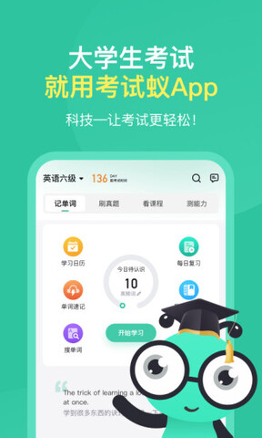 考试蚁app是高中生大学生都可以使用的专业学习软件,拥有计算机等级考试、四六级考试、驾考、考研公共课等丰富的课程,配有背单词、拆词记忆等免费功能,为用户提供方便快捷的学习服务。考试蚁app能在线阅读专业免费书籍,还可以进行线上考试,让用户及时查漏补缺,定制个性化学习课程,帮助用户顺利通过考试。