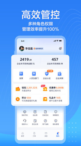 2.提供管理员、员工等子母账户管理功能,配备限费、监控预算等九大账户权限。