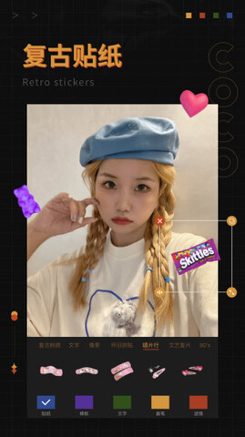 2.收集了很多复古贴纸效果,帮助您添加到图片中,还可以让您添加编辑文字哦。