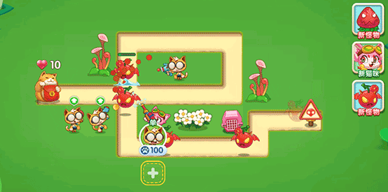 5、免费路径关卡:没有固定的路径,怪物可以在场景中自由寻找路径,把猫放在地图上可以阻止怪物前进。