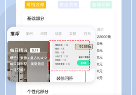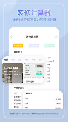 2.装修免费报价,装修计算器帮助你梳理装修过程中每一项花费预算,自行设置面积数量。