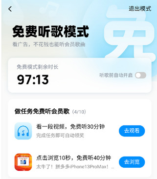 免费观看商业广告,轻松获得至少30分钟的免费会员歌曲播放时间。