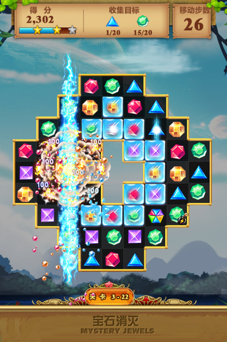 3.在游戏中,需要匹配3个或3个以上相同且相邻的宝石才能消除,消除的分数越多。