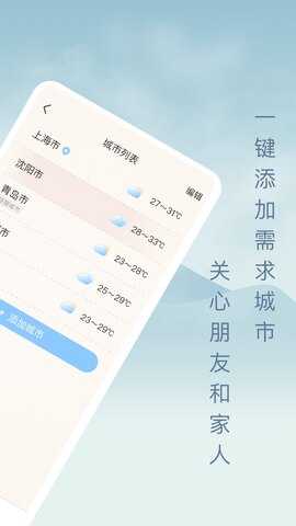 2.自动定位当前位置,手动添加需求城市,应对不同人群对定位的需求。