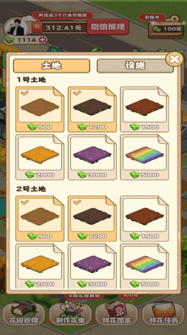2、土地解锁后可以种花卖钱,每一种花成熟后都会先收集到仓库里。