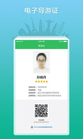 3、我的:提供导游的基本信息、执业记录、奖惩记录、游客评价、电子导游证、“全国旅游服务”微信微信官方账号二维码等信息。